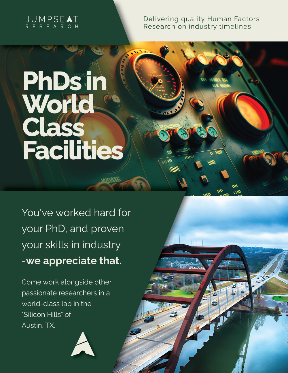 Jumpseat Research is an Austin, Texas-based world-class Human Factors research facility utilizing PhD researchers specializing in a number of different research fields.